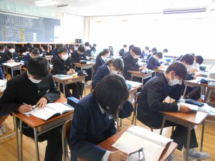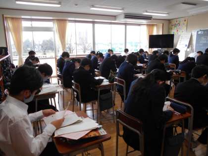 英語の授業は、ちょうどリスニングの問題に取り組むところでした。聞く力は1回では付きません。家庭でも英語のラジオ番組やテレビ番組を見たり聞いたり、また、英検の教材を使うのもよいですね。