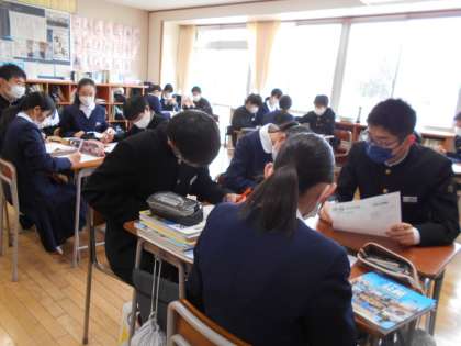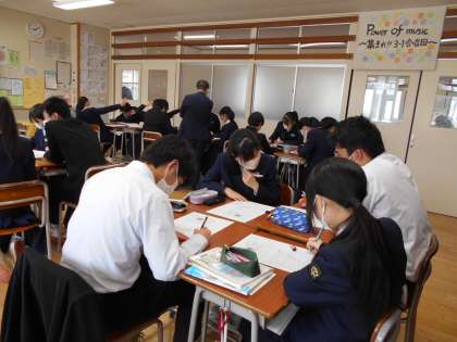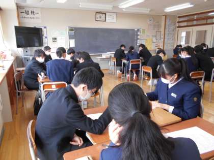 社会の授業の様子です。ワークシートを使って復習問題に取り組みました。分からないところをちょっと聞いたりしながら進めていました。この記憶が、試験当日ふっと「あのとき聞いた問題だな」と思い出すきっかけになることもあります。