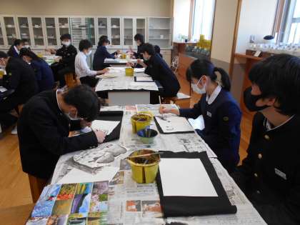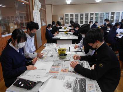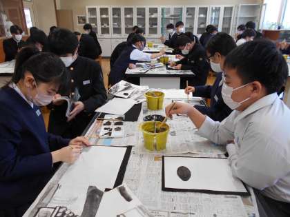 美術の授業の様子です。今取り組んでいる水墨画です。食べ物や植物、動物等、いろいろなものを濃淡を出しながら表現していました。