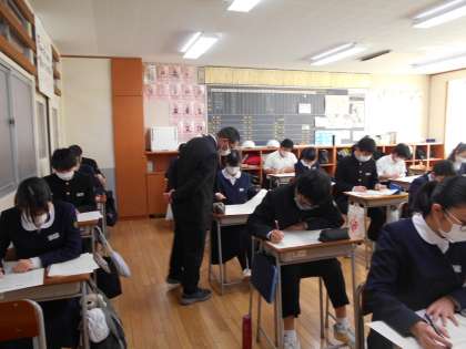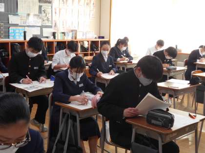 社会の授業の様子です。県立一般選抜まで約1週間。落ち着いて練習問題に取り組んでいます。