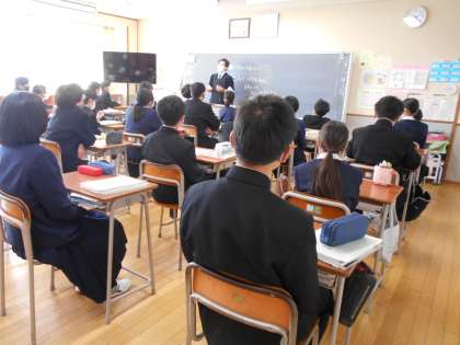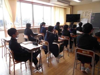 家庭科の授業では、学年末評価の振り返りをしました。これどうかなと答に疑問をもつことで、学びにつながることのお話がありました。