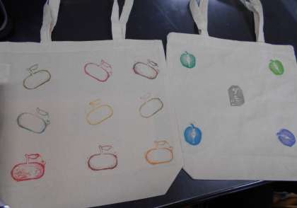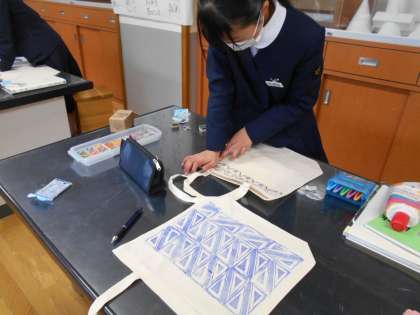 美術の授業の様子です。制作したゴムはんこを布製バックにプリントしました。それぞれオリジナリティーあふれるものに仕上がりました。