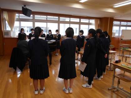 音楽の授業の様子です。1、2年生は当日式場に入りません。録画した合唱を見てもらうので、それに向けて練習中です。
