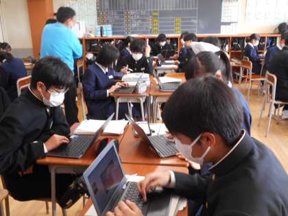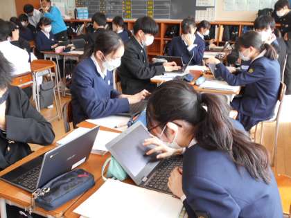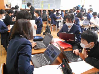 技術の授業では、修学旅行の見学先についてプレゼンテーションをします。資料作りの力だけでなく、発表する力も試されます。PRするポイントを押さえて制作しましょう。