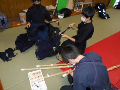 剣道部は、竹刀の修繕をしている人もいました。直しながら大切に使っています。