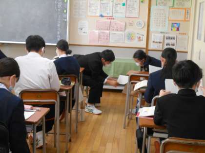 国語の授業では、自分の書いた随想を隣の人と読み合い、感想を伝えました。互いの思いを知ることは、とてもよい経験です。