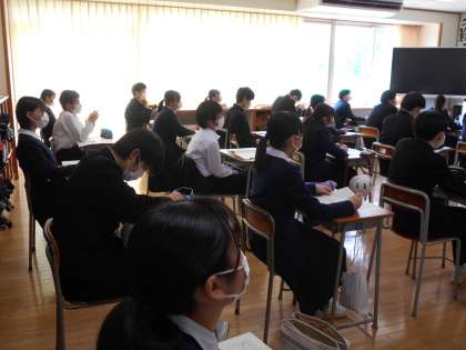 社会の授業では、県立一般選抜前のアドバイスがありました。記述式問題に対応するこつを生かして取り組みましょう。