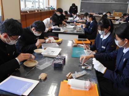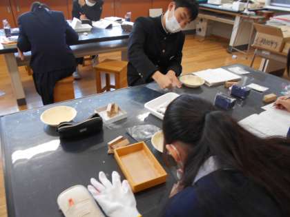 美術の制作した篆刻です。磨き上げている人もいれば、仕上がって、互いに鑑賞している人もいました。