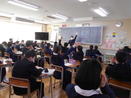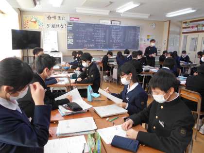 数学の授業では、取り組んだ問題の中で解けなかった問題を、グループ内で教え合い、解決していきました。どんどん聞くことを当たり前にしていきましょう。