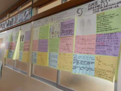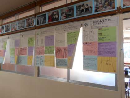 学年末評価後から、2学年廊下に「上級学校調べ」の掲示物が並んでいます。班ごとに分担して作成したものですが、それぞれの学校の特徴や制服なども分かりやすくまとめられています。「高校生の先輩に学ぶ」で聴いた先輩からのメッセージも参考に、1年後の進路選択に向けて、たくさんの情報を集めていってほしいと思います。