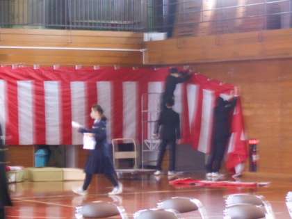 明後日の卒業式に向け、紅白幕やステージ幕、卒業生の席、来賓席、職員席等の準備を行いました。また、ステージ周辺や体育館トイレの清掃も行いました。分担以外の場所を手伝うなど、臨機応変に動いている生徒も多く、大活躍の2年生でした。卒業式には代表生徒しか出れませんが、「式場準備」という形で、3年生の先輩方への感謝の気持ちを表せたのではないでしょうか。