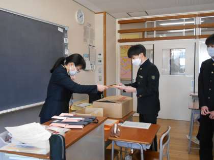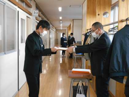 各クラスで通知表や卒業記念品が渡されました。担任と一緒に、3年間の頑張りと成長を確認することができました。明日はいよいよ卒業式です。保護者の皆様に、3年生が立派に成長した姿をお見せできると思います。