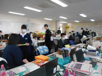 今日の朝、3年生代表生徒が職員室を訪れて、教職員に感謝のメッセージを届けてくれました。3年生が一人一人気持ちを込めて書いたメッセージを受けとった教職員も、嬉しそうな表情でした。