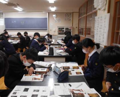 美術の授業では、「仏陀」について、資料集等を使って勉強しました。