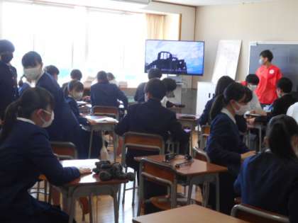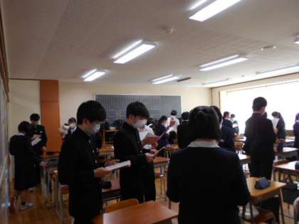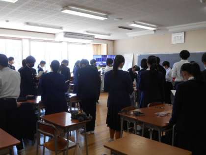 学活の後半は、修学旅行で広島を訪れた際に、平和学習の集大成として歌う「折り鶴」の練習をしました。以前の平和学習で考えた歌詞に込められた意味を思い出しながら歌っている生徒もいました。