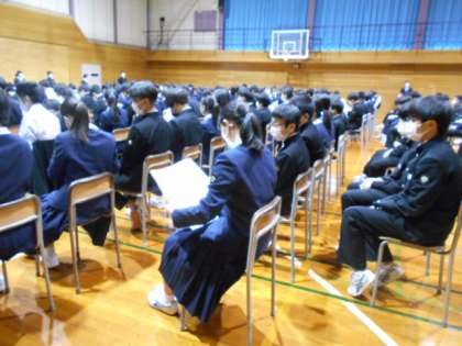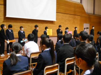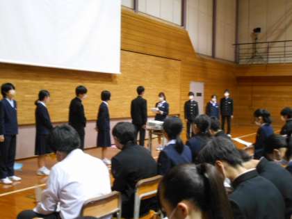 初めに学年生徒会から、各クラスのよいところの発表がありました。「授業と休み時間のメリハリがある」「クラスのみんなを笑顔にしてくれる人がいる」など、たくさんのよいところが紹介されました。また、学年生徒会で取り組んだ活動について振り返り、分析結果と共に紹介するなど、次年度につながる発表でした。取組の優秀クラスへの表彰もありました。
