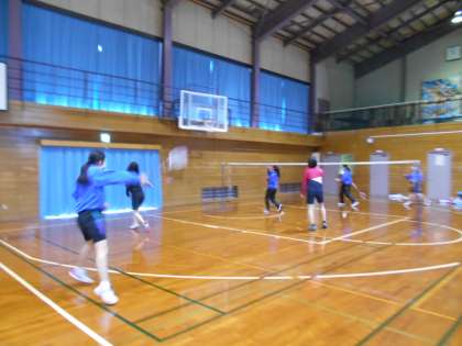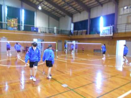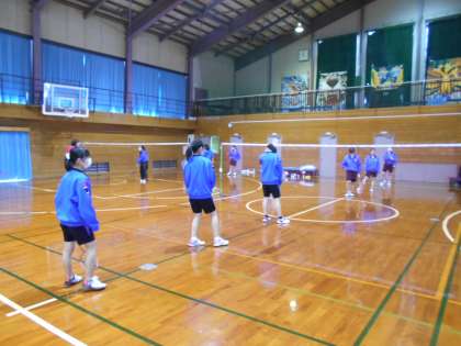 女子バドミントン部の様子です。女子も縦に3人ずつ並び、フットワークの練習をしました。とっさに反応して動くことができるようになるまで、何回も練習しましょう。