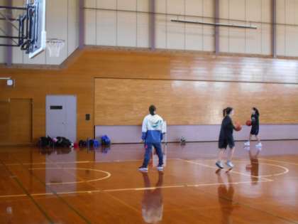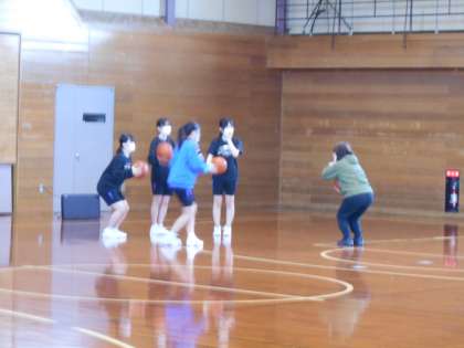 女子バスケットボール部の様子です。コーチや顧問の指導を受けながら、ステップ等、動きの確認をしていました。