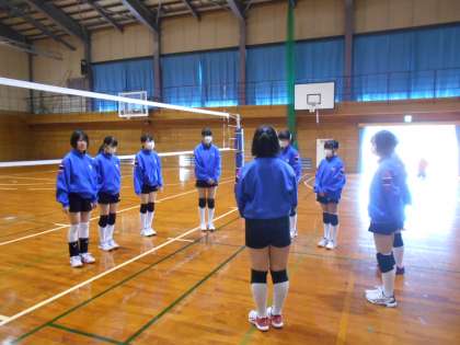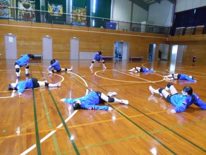 バレーボール部の様子です。練習前のストレッチを念入りにしていました。けがの予防のためには欠かせません。