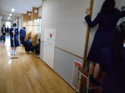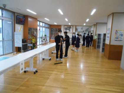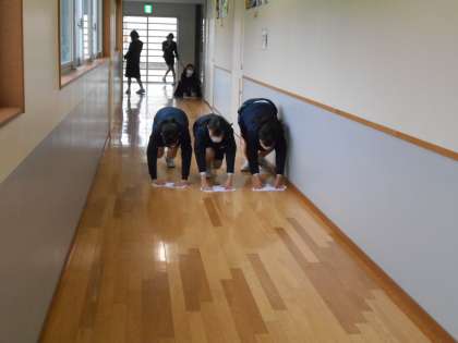 2年生は、入学式前に校内の清掃を担当しました。玄関、廊下、階段、1年教室前廊下等に分かれて、ほうきでゴミを掃き、水拭き雑巾でさらにきれいにしてくれました。