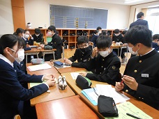 「学級開き」で担任が思いを語った後は、生徒同士で話し合い、清掃・給食当番の分担を決めたり、月曜に行われる「自己紹介」の準備をしたりしました。左:4組、中:5組、右:1組の様子です。