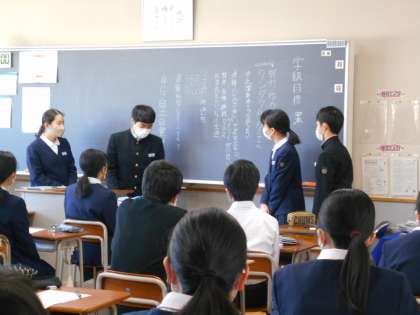 今日の学活では、学級組織を決めたり、学級目標を考えたりしました。それぞれのクラスで、工夫しながら進めていました。学級目標の検討では、早速学級役員が前に出て話し合いを進めているクラスもありました。