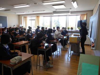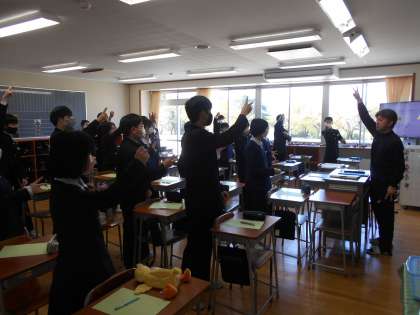 左:3組の人間関係づくりプログラムで、ネームラインをしている様子です。中:4組でビンゴをしている様子です。右:5組でじゃんけん大会をしている様子です。どのクラスもわきあいあいと新しい仲間との関係づくりに取り組んでいました。