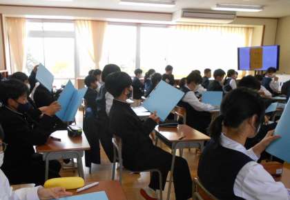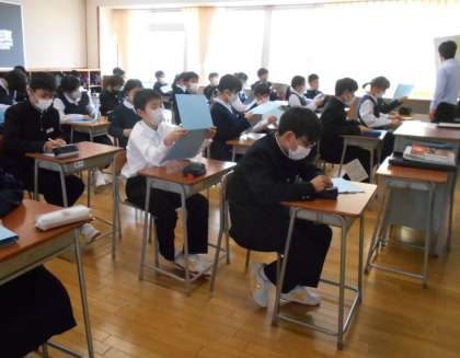 社会の授業では、授業の受け方やファイルの使い方等についてお話がありました。みんな新しい先生との出会いに、ちょっと緊張しながらも元気に質問する様子も見られました。