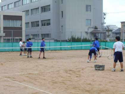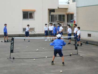 ソフトテニス部の様子です。1年生は2年生に指導してもらって、練習をしていました。