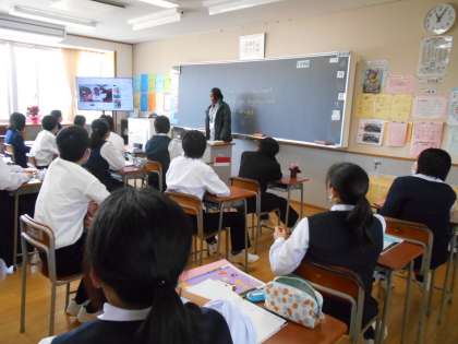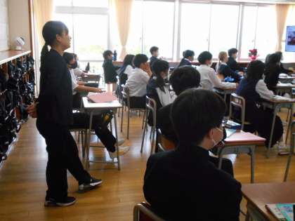 英語の授業では、ALTの先生の自己紹介を聞きました。とても明るい性格の方で、音楽を聴きながら、生徒のみなさんも思わず体が一緒に動いていました。