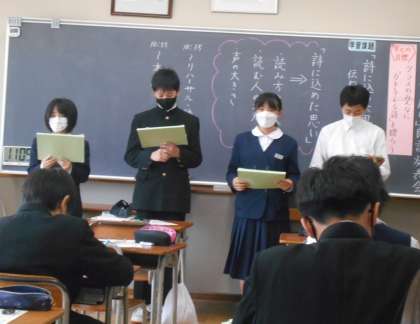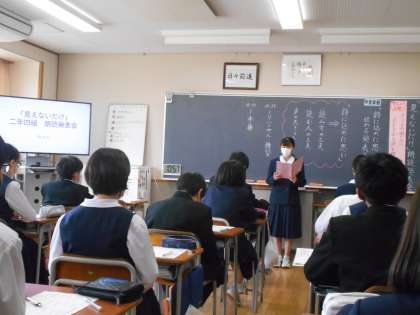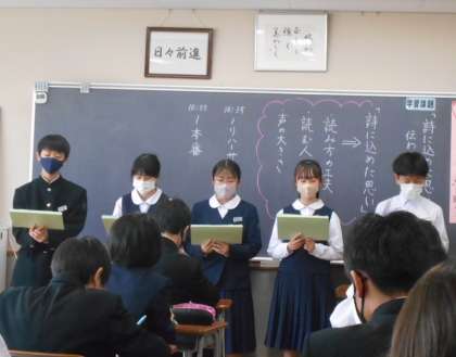 国語の授業での詩の朗読発表会の様子です。「見えないだけ」という詩に自分たちが考えた言葉をプラスして、クラスの仲間を応援する詩に仕上げました。このクラスでは、前に進もうとしている、輝きだそうとしている、かすかに見えてきているなど、不安な中でも自分たちの力を信じている、そして、仲間と共に進もうとしている気持ちが伝わりました。どのクラスもすばらしい発表会でした。