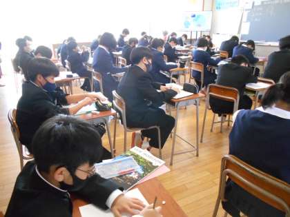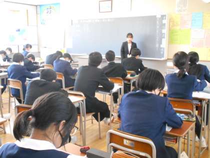 英語の授業では、歌を歌った後、帯学習として取り組んでいるマシンガントークなど、普段からの様子を見ていただきました。