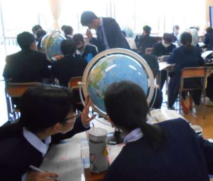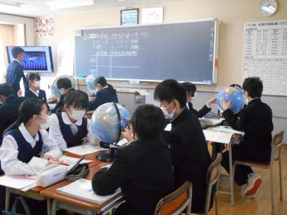 社会の授業では、地球儀をよく見て、世界地図との違いを考えました。どんなことが分かったのでしょうか。