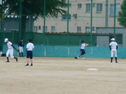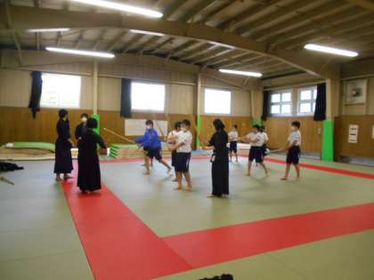 野球部は、上級生と1年生のペアをつくって練習をしていました。剣道部は、上級生が素振りの指導をしていました。
