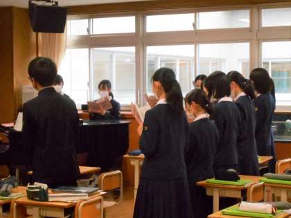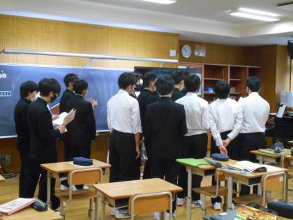 音楽の授業では、校歌の他、修学旅行先の広島平和記念公園で歌う「折り鶴」を練習しました。心を込めて歌えるように練習をしていきましょう。