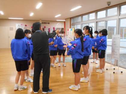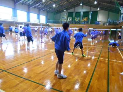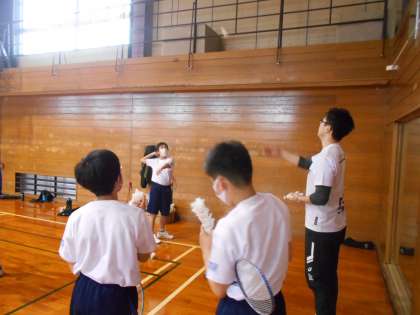 バドミントン部の様子です。女子はエコスペースで、グリップの持ち方から確認していました。男子はコートで、シャトルを打って練習です。