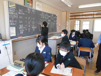 理科の授業では、電離の様子をモデルで表すことに取り組みました。分からないところはグループを超えて、教え合っていました。