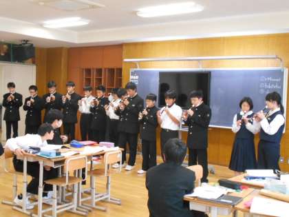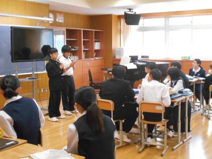 音楽の授業では、アルトリコーダーの練習の成果を発表しました。積極的に発表した2人に続いて、たくさんの人が前に出て発表できました。えらい!
