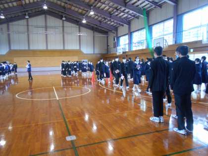 体育館を富山駅に見立てて、集合練習をした後、JRの乗車隊形の練習をしました。