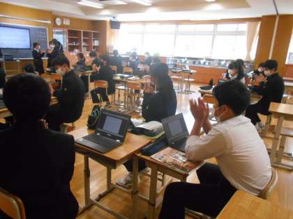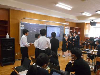 音楽の授業では、リズムの勉強をしていました。音符を見て拍子を取る。勇気を持って前に出てチャレンジする姿もありました。