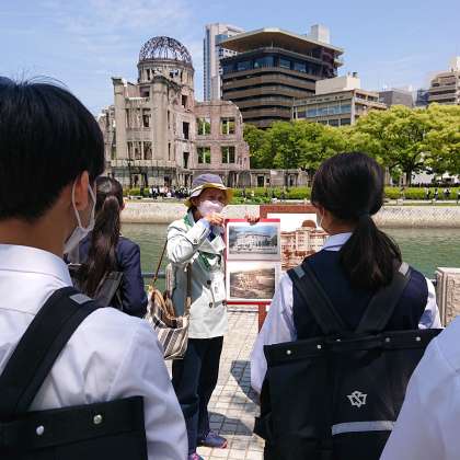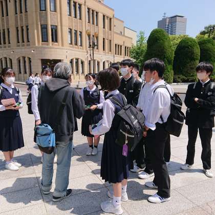 公園の色々なところで水に関わる記念碑があることや当時苦しまれたお話を聞き、平和について考えを深めていきました。
