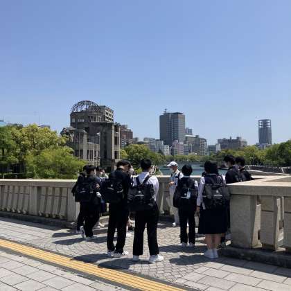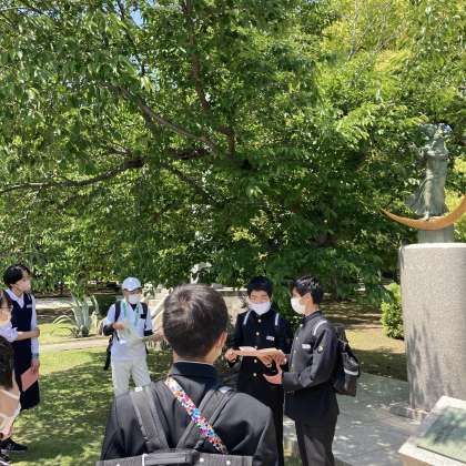 ボランティアガイドさんの案内の下、原爆ドームや公園内に数多くある「平和の碑」を巡りました。碑の前では、事前学習で調べたそれぞれの碑についての発表をし、ガイドさんから補足をしてもらいました。事前学習では知ることのできなかった内容を、解説してもらうたびに、犠牲になった方々を悼む眼差しで見学をしていたのが印象的でした。