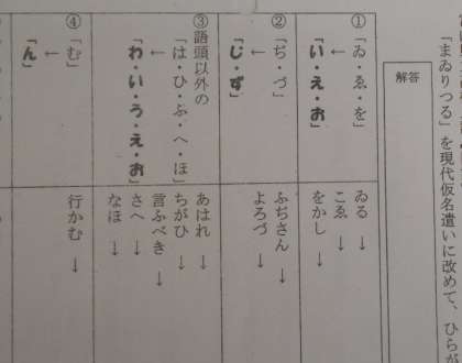こくごの授業では、枕草子を勉強します。今日はまず、歴史的仮名遣いの復習をしました。