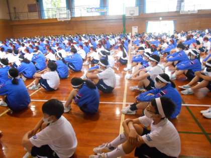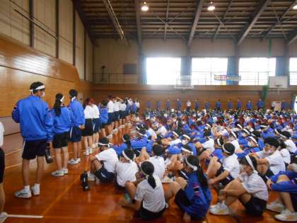 天候が悪く、5限は団別活動を全体練習に変え、体育館で開閉会式の練習をしました。間隔をなるべく取って並び、開閉会式の流れを確認しました。