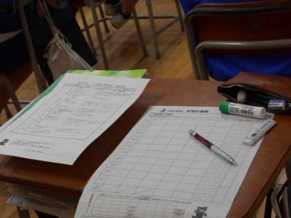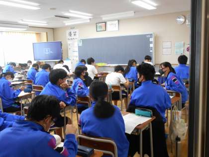 中間評価の範囲発表があり、テスト勉強の計画を立てました。3年生になって初めての定期評価で、気合い十分な雰囲気が伝わってきました。早速ワークで練習問題に取り組んでいる生徒もいました。