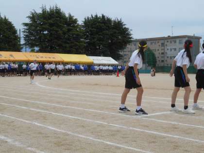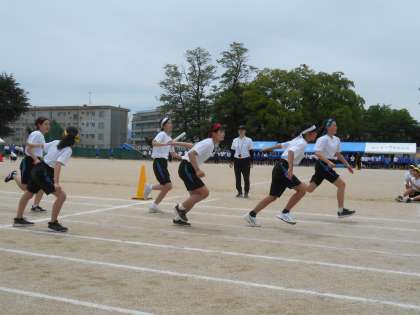 各団、1年生の代表が出場するリレーです。走るだけでなく、息の合ったバトンパスも勝敗の鍵を握ります。