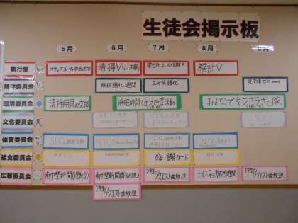 今年度前期の生徒会活動の予定です。もう5月の活動を終え、6月の活動に入りました。より活発な生徒会活動になるように、生徒会執行部始め委員長、委員が先頭に立って、みんなで取り組んでいます。