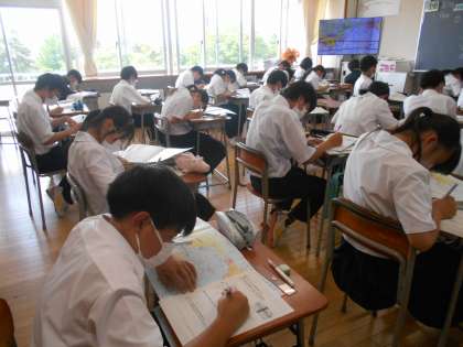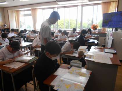 社会の授業では、世界から見た日本の位置を表現しようという課題に取り組んでおり、今日は韓国から見た日本を分かりやすく伝えることを考えていました。