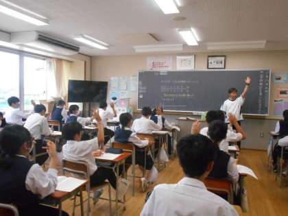 数学の授業では、2元1次方程式の解は1つではないことを勉強しました。自分が思いつかなかった意見もあり「あ〜そうか」という様子でした。