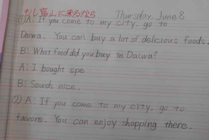 英語の授業では、「If you come to my city,〜」という書き出しで対話文を考えました。それぞれアイディアあふれるものになりました。